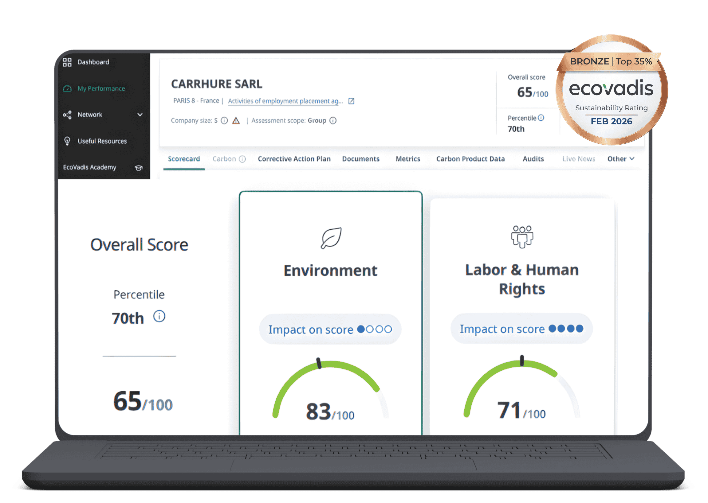 At Carrhure Executive Search, governance is not only what we advise on. it is how we operate. Our latest EcoVadis Sustainability Assessment (Feb 2026) confirms our commitment to responsible and ethical business practices. Overall Score: 65/100, 70th Percentile – Bronze Medal (Top 35%)