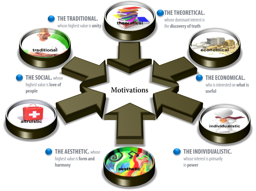Dr. Eduard Spranger, a German idealist, philosopher, psychologist, and educator, published a book titled, Lebensformen in 1914. The book was later translated into English titled Types of Men: the Psychology and Ethics of Personality in 1928. His research and observations lead him to the development of 6 attitudes, values or motivators. He believed that a person is defined by what he or she finds valuable, important, good or desirous.