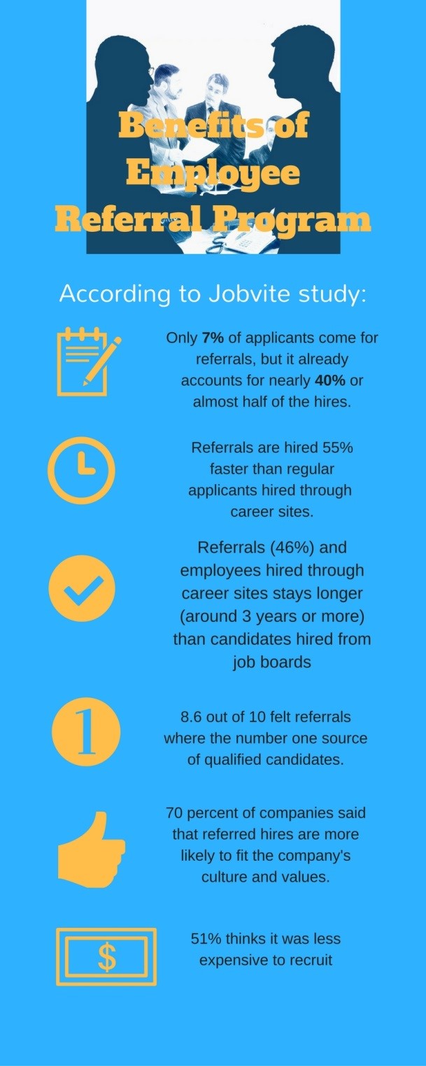 Lastly, referred candidates are most likely to stay for a long time. As mentioned in the infographic above, since they are already pre-screened to see if they are suited to the kind of culture and environment that you have in your organization, they can fit in easily and will stay in your company longer than candidates hired through career sites.